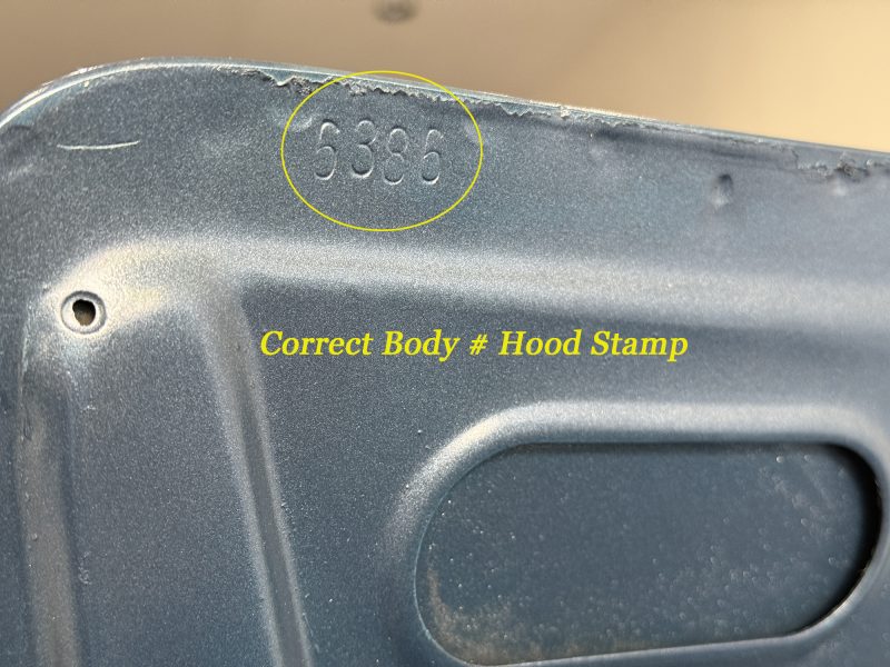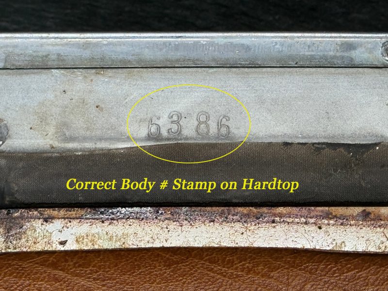 All original sheet metal and floors. Correct body # stamped on hard top, hood, and transmission plate.