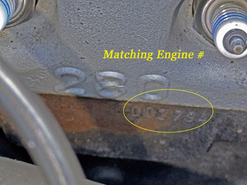 All ID plates/stamps in place. Matching # engine. Original trunk floor and rear body light panel.