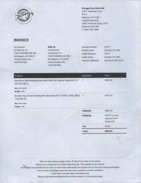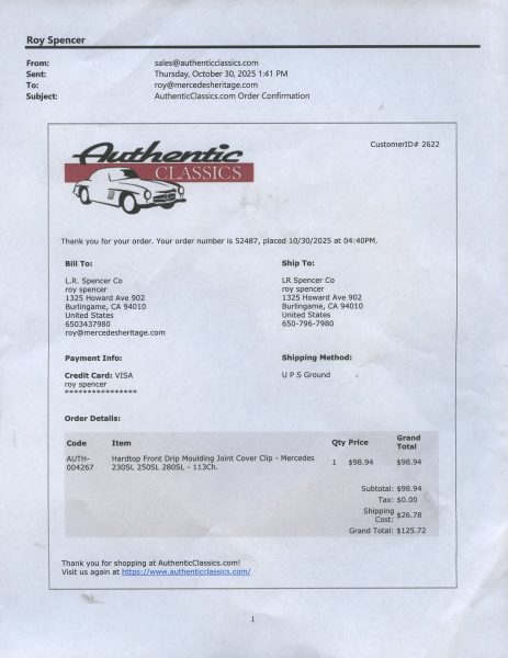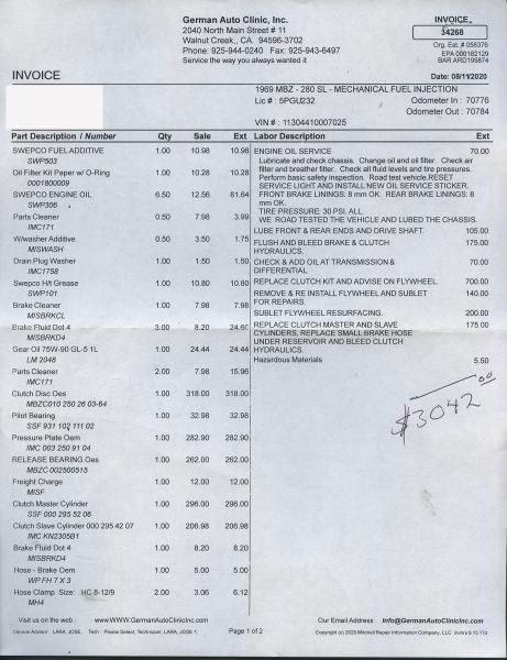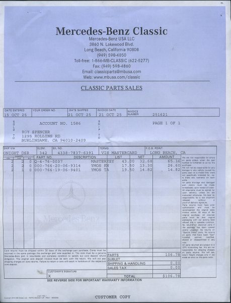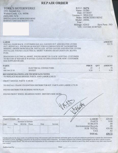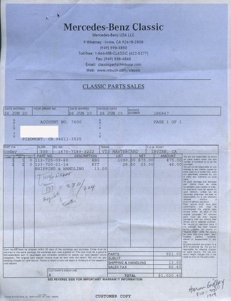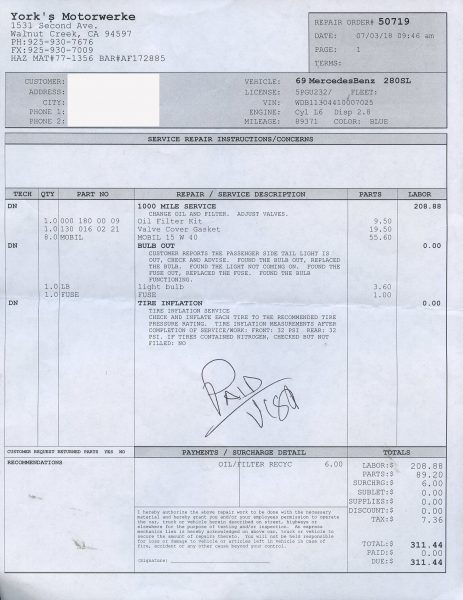 1968 280SL - ID#113044-10-007025 - Engine # 130983-10-002794 - Transmission # 2227