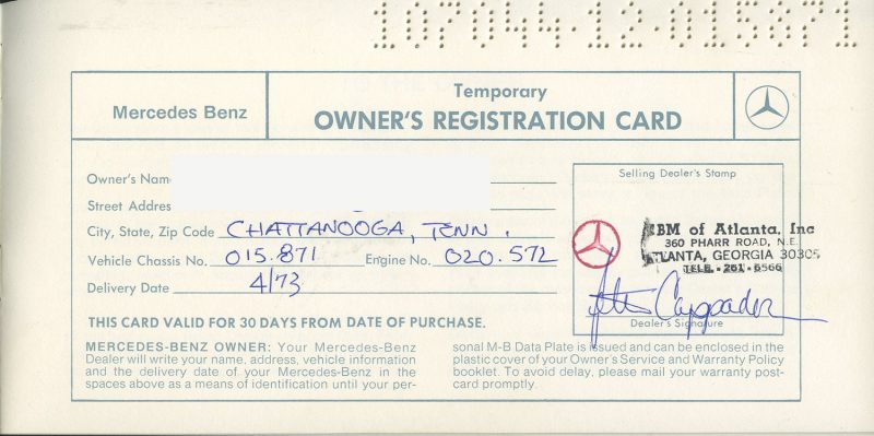 Sold new March/1973 by RBM of Atlanta, INC to a Mr. Shepard of Chattanooga, TN